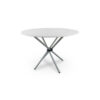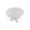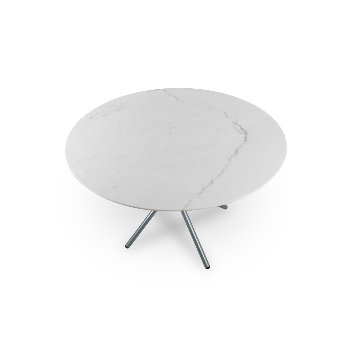 A modern four-leg, spiraling chrome base hoists up a brilliantly honed piece of inverted edge Italian Calacatta. This versatile design can be used to spruce up a breakfast nook or formal dining room.