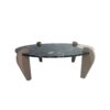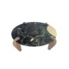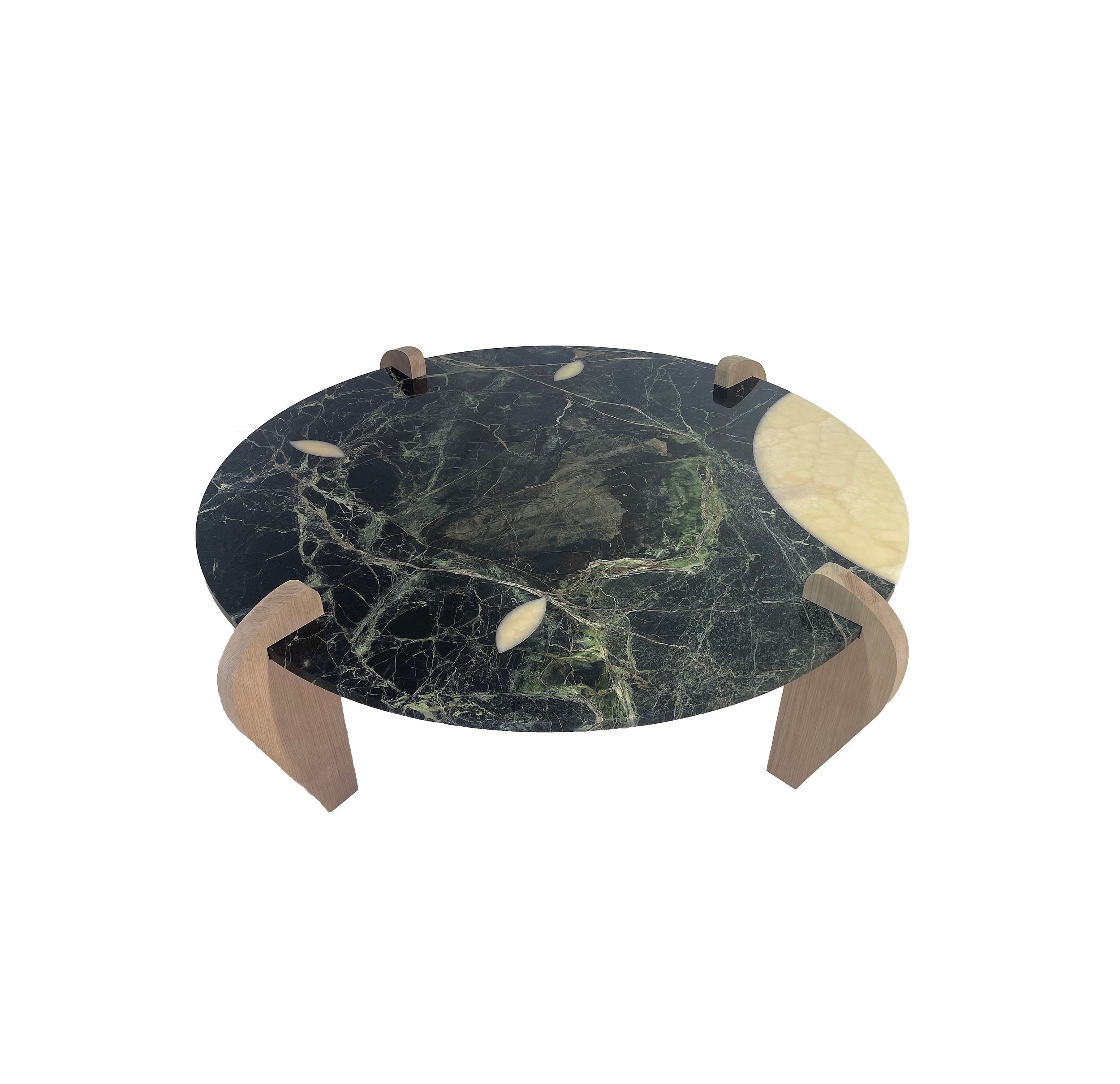 A green marble top with honey onyx inserts and a raw finished wood base.